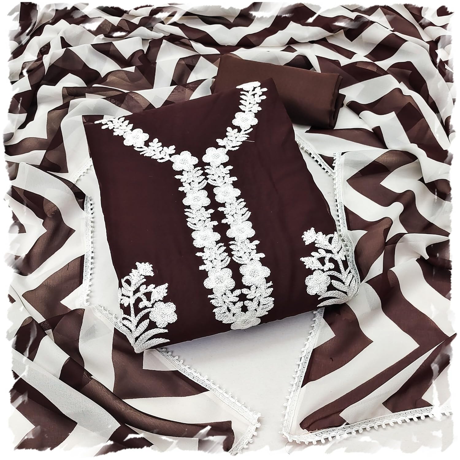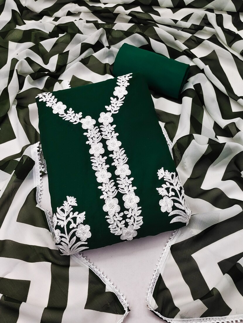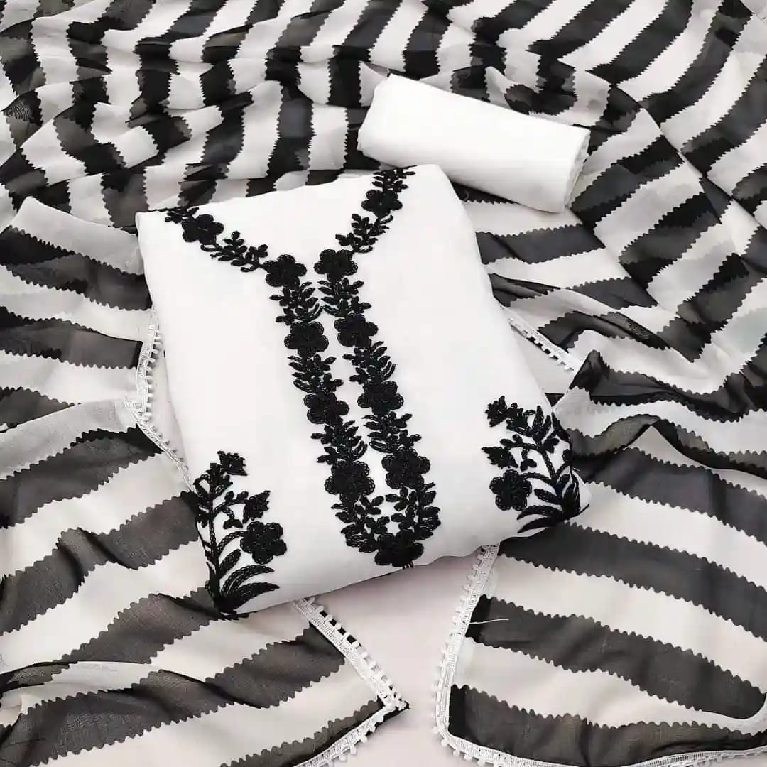 কাশ্মীরী আড়ি এম্ব্রডারী থ্রি-পিচ। জামাঃ সুইচ কটন বুকে সম্পুর্ন