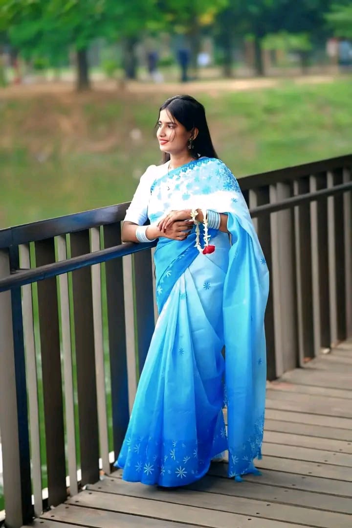 - সফট ব্লু ও হোয়াইট গ্রেডিয়েন্ট বেইজে চোখ জুড়ানো ডিজিটাল ফুল প্রিন্টের কাজ।