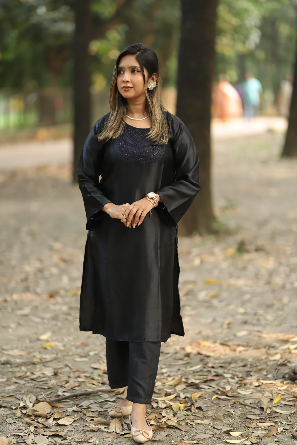 জামা:- জাপানি সিল্ক কাপড়ের গলায় নেকলেস ডিজাইনের কাজ করা থাকবে!